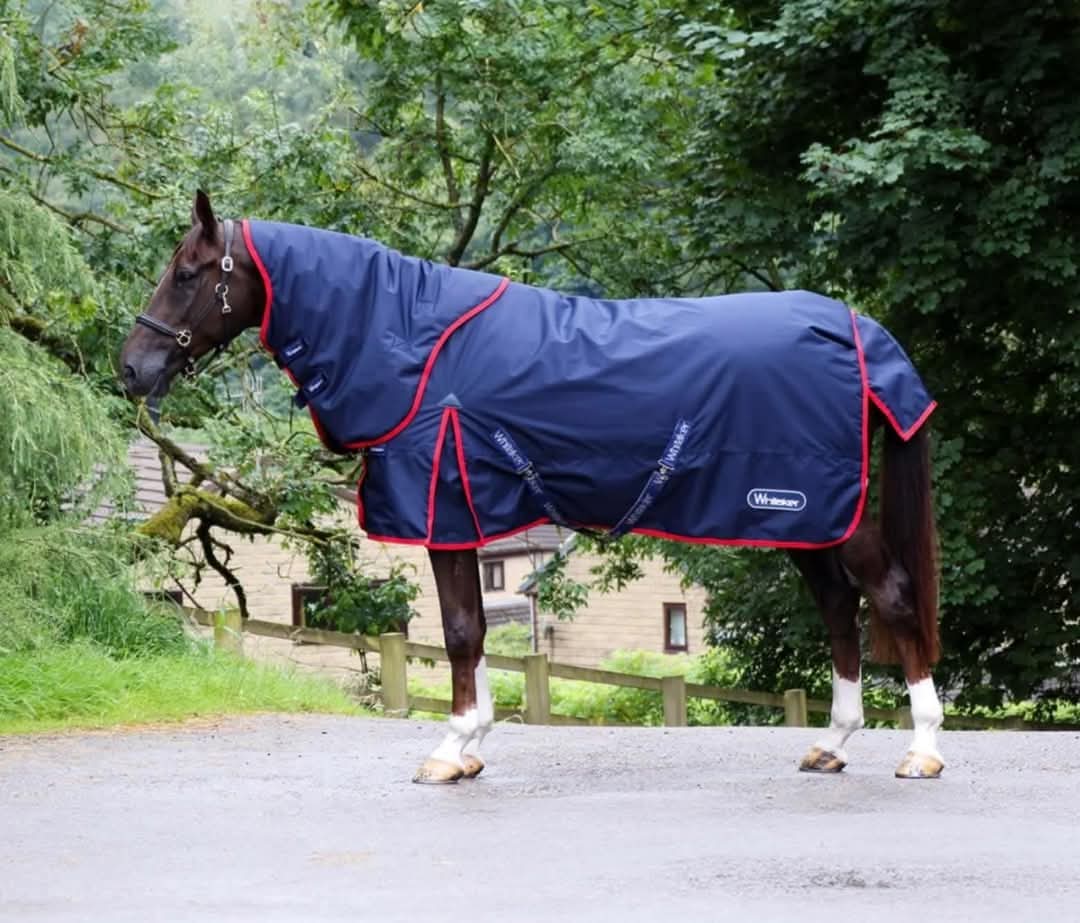 Warm and cosy 250g fill with a faux fur witherpad to alleviate pressure and a waterproof upper to avoid the pad becoming sodden. Includes trigger clip chest fastenings with buckle adjustment and easy replacement, elastic and velcro straps to secure the hood to the rug. 3 chest D-rings on the chest, crossed belly surcingles, two single lock velcro fastenings on the hood and elastic leg straps to keep the rug secure. Classic navy, red and white colour scheme with Whitaker branded straps. Also includes a tall shoulder gusset and anti-rub and anti-static polyester lining to maintain coat health and shine. Perfect for total protection against the toughest weather.